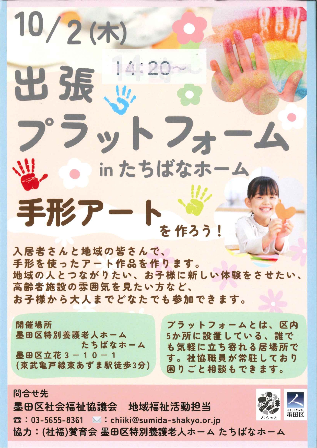 地域住民の多世代交流と相談の場として現在区内5か所で開設している地域福祉プラットフォーについて、普段のプラットフォームと離れた地域で出張プラットフォームとして開催しています。 昨年度の引き続き、たちばなホームで入居者さんと地域の方皆さんで交流しながら開催します。