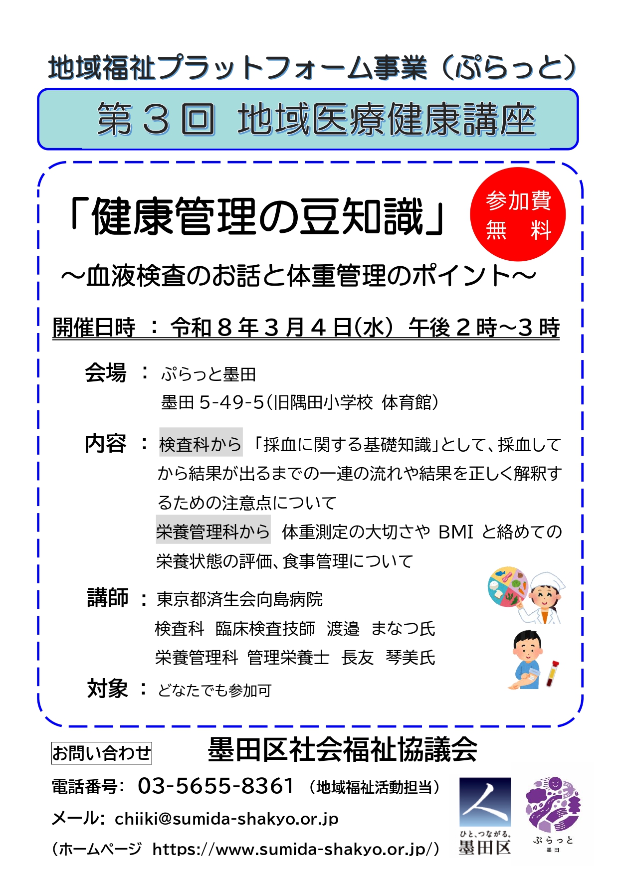 地域住民の多世代交流と相談の場として開設している ぷらっと墨田(地域福祉プラットフォーム) にて、東京都済生会向島病院の方にご協力いただき、地域医療健康講座を開催します。
