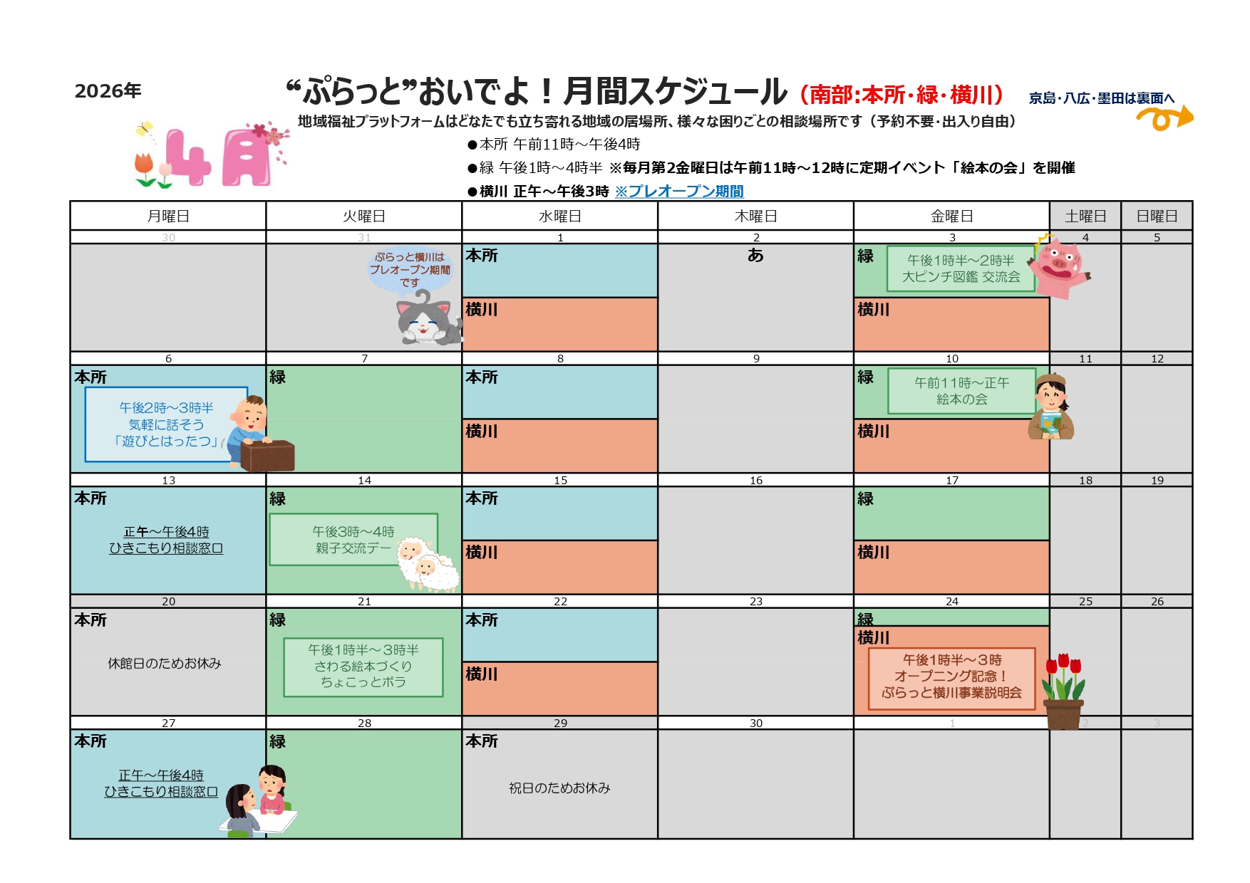 どなたでもお気軽にお立ち寄りください。なお、ご相談のある方は、できるだけ事前に地域福祉活動担当までご連絡ください。