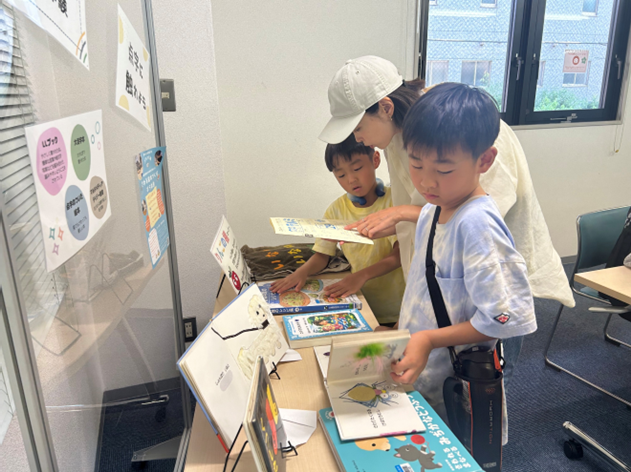 また、ひきふね図書館より「りんごの棚」(障害のある方や特別なニーズがある方が楽しめる資料を集めた棚)の資料をお借りし、さわる絵本や点字付きレシピ本等、参加者の方に自由に手に取っていただき、障害のある方への理解を深めることもできました。
