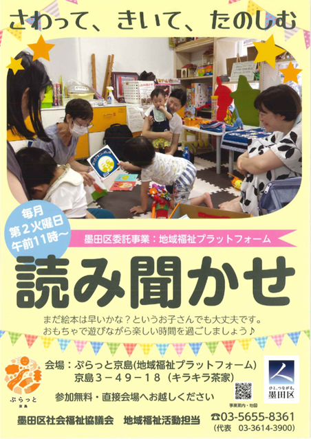 墨田区の委託を受け、墨田区社会福祉協議会が運営している「多世代交流と相談の場」ぷらっと京島(地域福祉プラットフォーム)にて、お子さん向け読み聞かせ~クリスマスバージョン~を開催しました。